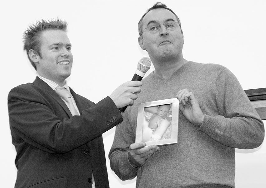 Winner Mark Nyman displays his mascot - a photo of his one week old son, Max