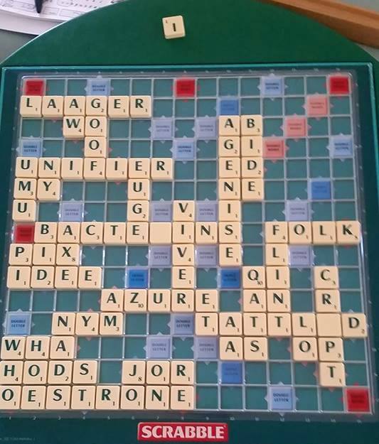 A scrappy effort with me trailing all the way. The endgame features mistakes on both sides. Neil plays a phoney to block the triple lane, I challenge it off and leap in with SIRNaME for 86 and 'Out'! I have won. Except I have forgotten there are still two tiles in the bag. Moving on...